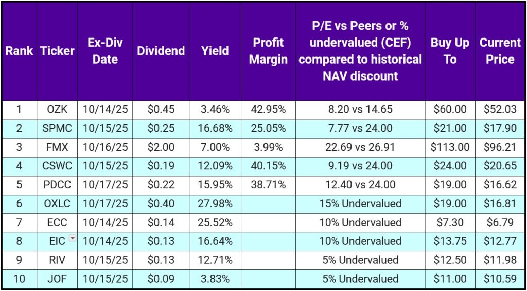 Well, look who showed up again — the CEF crowd. This week’s list is 5 CEFs and 5 stocks, and the split couldn’t be more obvious.