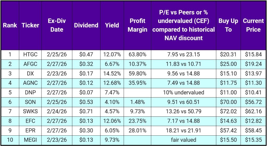 This week’s list is actually pretty good. A mix of undervalued dividend growers and high-yield names with clear “know what you own” risk.
