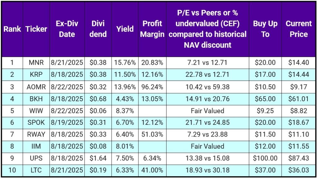 Our holdings from this list: MNR, KRP, BKH, WIW, RWAY, UPS, LTC.